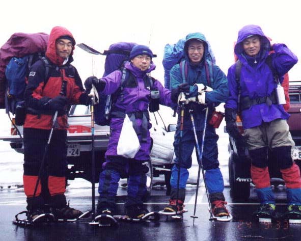 トップへ 前の写真 次の写真 これは 「道路で遊んではいけません!!」 という教えを忘れた4人の男たちの75枚におよぶ記録アルバムである。 鳥取県からスタートし、国道482号線で峠を越えて兵庫県まで・・・ "我が家"建設用地を求め、ひたすら歩くのだった。 左から「絹川一郎」「マスター」「エテ吉」「八木雅弘」の面々である。