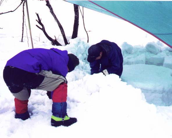 雪からブロックを削りだし、居間の居住性の向上に努める。