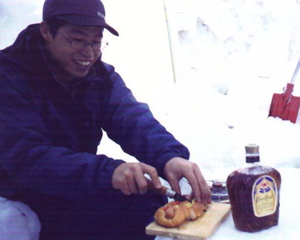 エテ吉が 「午後のお茶」 にパンを焼き、お茶の代わりに酒を飲む。
