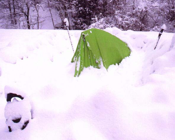 スノーシューの半分以上が埋まっている、この晩だけで30センチ以上積もった。