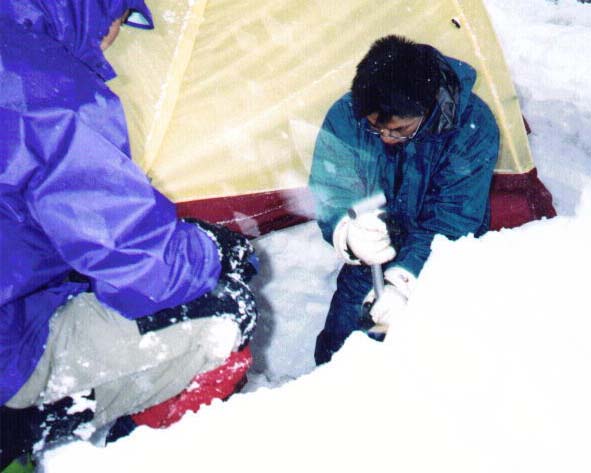 トップへ 前の写真 次の写真 前夜の 「積雪に寝室押しつぶされ事件」 に懲りて学習し、 部屋の周りに深い溝を掘り、地下から寝室に入れるように改造するエテ吉。 (部屋の外壁に降った雪を溝に、すべらせ落として安らかに寝よう、という作戦である)