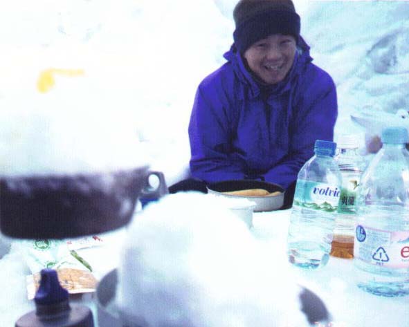 トップへ 前の写真 次の写真 元気に3日目の朝を迎えた。 ジュウジュウ美味しそうな音を立てて焼けるウインナに笑顔がこぼれる。 手前では鍋の蒸気で雪を溶かし、水を作っている。 それをコーヒーフィルタで濾し、ミネラルウォーターとする。