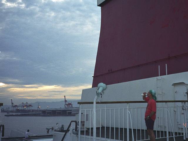 ビールを片手に出港を見送る。 短いとはいえ船旅至福の時