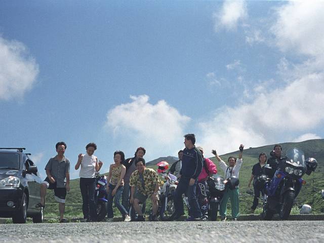 晴れ渡った阿蘇山上駐車場で記念撮影。 ここで 「解散!」 を宣言した