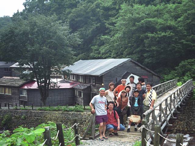 残り1名も合流して全員集合の宿 「孫六温泉」 を背景に