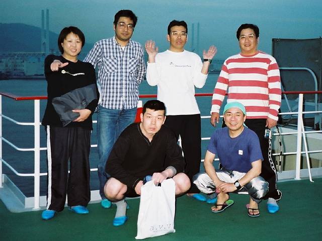 6名揃って出航をデッキから眺める。 フェリーは旅情を誘う。