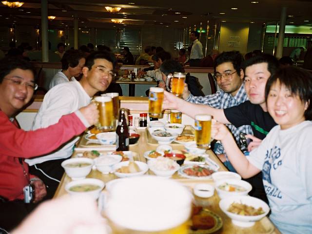 入浴後レストランに集合。 「カンパイ!」 風呂上りの生ビールが最高。
