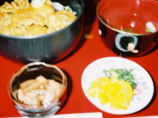 長門市仙崎に移動して 「ウニめし」 を食す。 イカ刺しが美味! (ピントが甘い)