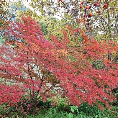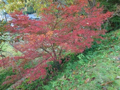 ワタクシが田舎暮らしの自宅斜面に勝手に植えたモミジが今朝、真っ紅に